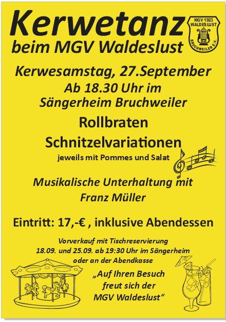 am 21. September findet wieder unser Kerwetanz im Sängerheim statt. Wir freuen uns euch ab 18:30 begrüßen zu dürfen.
